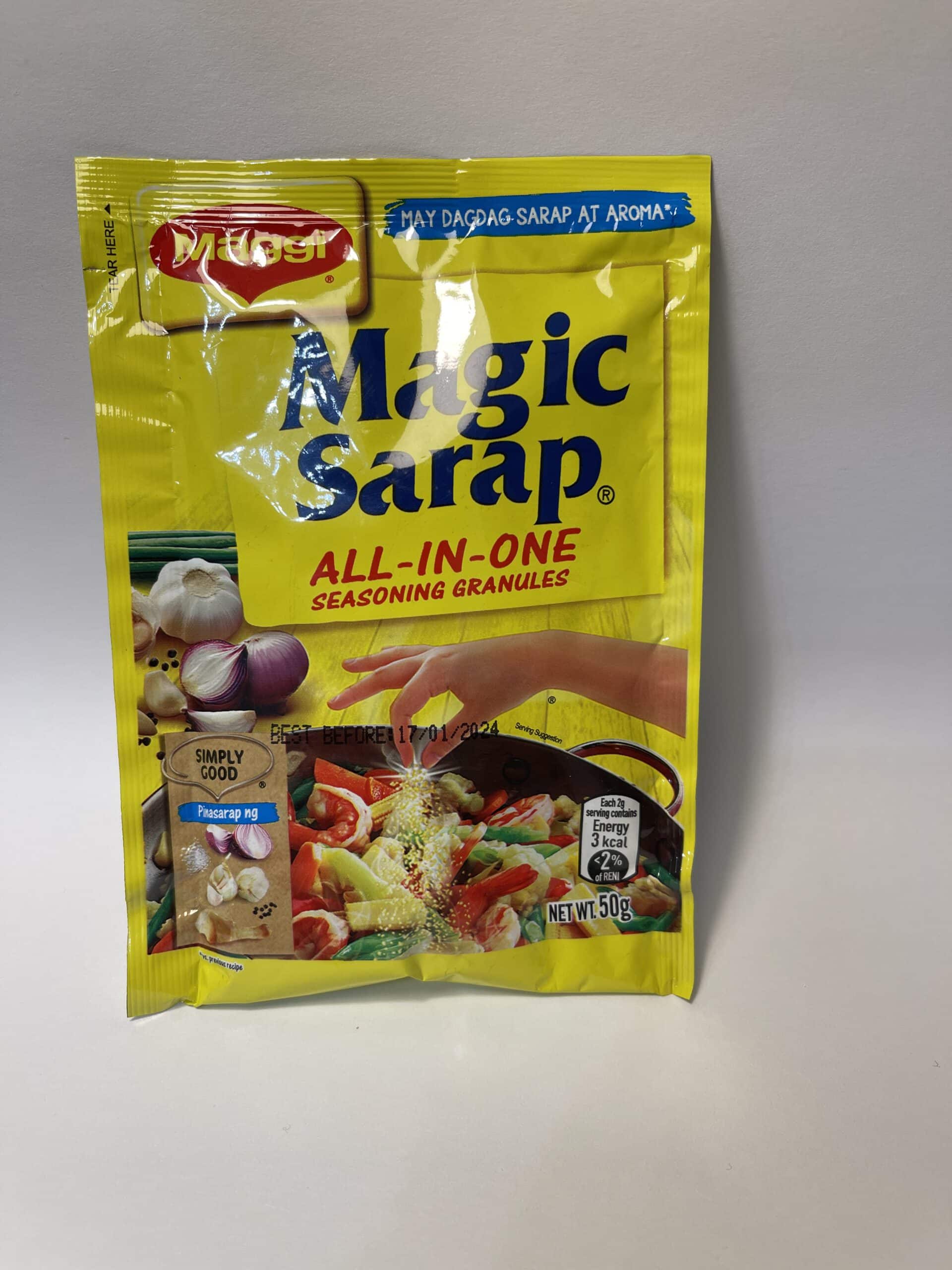 Ingredients: salt, monosodium glutamate, sugar, brown sugar, disodium guanylate, disodium inosinate, garlic, onion, flavour and artificial flavour (wheat), spice, turmeric.