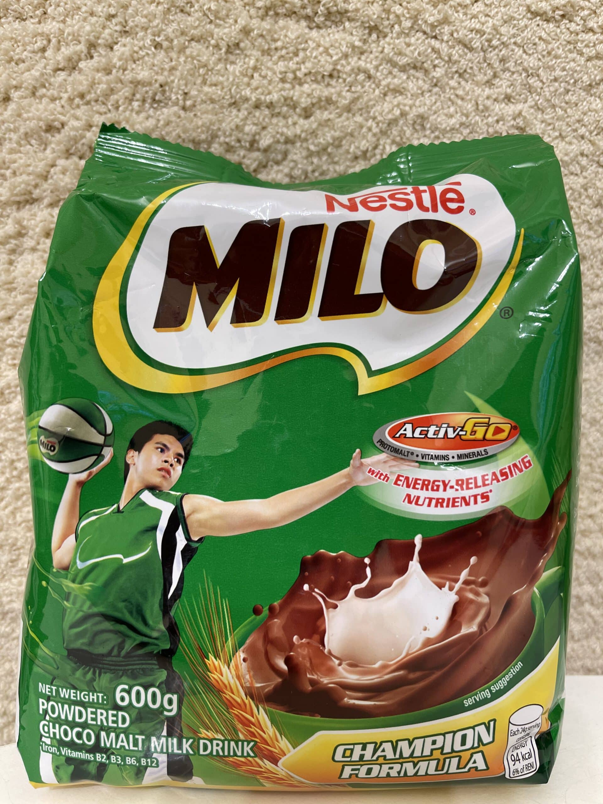 Ingredients: protomalt malt extract (contains barley), skimmed milk (cow’s milk), sugar, cocoa, palm Oil, minerals (dicalcium phosphate, disodium phosphate, ferric pyrophosphate), vitamins (C, B3, D, B6, B2, B12), vanillin.